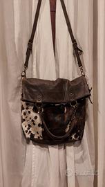 Bellissima e capiente borsa in pelle e cavallino, larga 40cm e alta 50cm. Può essere portata a mano, braccio, spalla e a tracolla. Manici e tracolla sono rimovibili con dei piccoli moschettoni, e la tracolla può essere agganciata a due diverse altezze, trasformando la tote in una messenger. Originale e in ottime condizioni, l'avrò utilizzata un paio di volte.