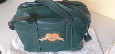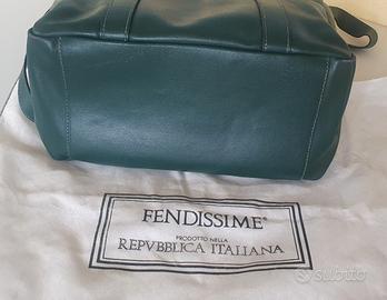 Borsa Fendissime, ovvero, linea Fendi made in anni 90 ideata da Silvia Venturini Fendi per offrire un prodotto giovane e frizzante al pubblico giovane. In pelle morbidissima color verde bosco con cuoricione arancio corallo e placca in metallo con logo sulla grande patta frontale.
