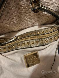 Borsa modello hobo in tessuto crema con dettagli oro e nappine decorative.