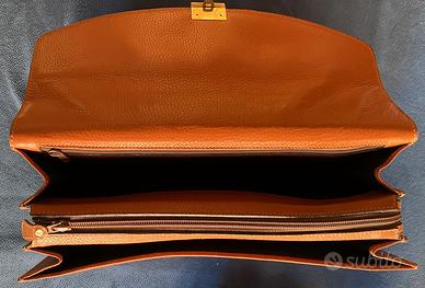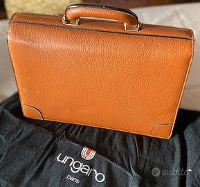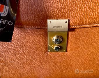 Borsa medico E. Ungaro in pelle martellata color cognac, tre scomparti interni più due cerniere. Dimensioni cm. 35 x 27 x 12 completa di cartellino e confezione originale. Chiusura a scatto in ottone dorato spazzolato, fodera nera con logo E. Ungaro. Nuova mai usata.