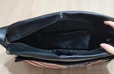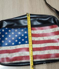 borsa a tracolla (modello messenger bag) anni 2000 y2k 00s con design vintage e urban, Ispirazione Indie-Rock,street-wearideale per chi ama uno stile casual e retro. in resistente pelle sintetica (finta pelle) di colore nero, materiale che garantisce resistenza e facilità di pulizia. Il pannello frontale è dominato dalla stampa della bandiera degli Stati Uniti (Stars and Stripes) con effetto invecchiato o "grunge", che conferisce all'accessorio un aspetto vissuto. con Ampio scomparto principale con chiusura a zip per riporre documenti, tablet o oggetti personali.con Tasca frontale aggiuntiva con cerniera per gli oggetti di rapido utilizzo. con Tracolla regolabile in robusto tessuto nero, che permette di indossarla comodamente a spalla o a bandoliera. perfetto per il tempo libero, i viaggi o l'uso scolastico quotidiano. effetto "distressed" I colori sono leggermente sbiaditi e la superficie ha una texture che imita l'usura del tempo, richiamando lo stile delle vecchie borse da viaggio o dei cimeli dei concerti rock.