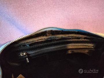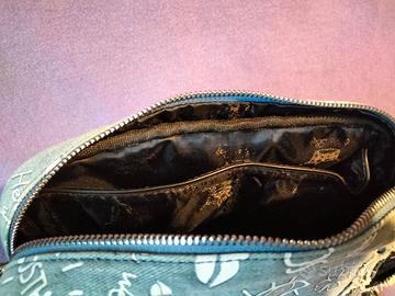 dimensioni cm 28 x 18 x 6 circa, tracolla lunga in catena con inserita una fettuccia di stoffa jeans, cerniera esterna e cerniera interna in metallo perfette, altri due scomparti interni.