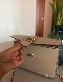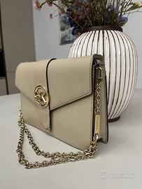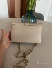 Raffinati dettagli in metallo color oro, come la tracolla in catena, removibile perfetta per poter utilizzare la borsa anche come pochette. Impreziosita dalla chiusura con patta e meccanismo frontale con logo. Interno foderato ed organizzato con tasche e comparto con zip.