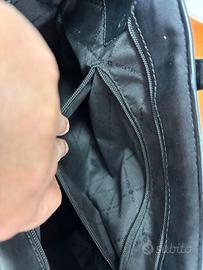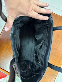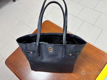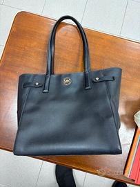 Borsa modello Carmen Large Tote di Michael Kors, caratterizzata dal logo circolare metallico con le iniziali "MK" al centro e da due sottili manici superiori. Realizzata in 100% pelle bovina martellata, morbida e molto resistente. Presenta dettagli laterali con cinturini e borchie metalliche dorate. Interno pulito e perfetto, include una chiusura superiore con cerniera, fodera in tessuto personalizzato, una tasca con zip e diverse tasche a bustina per l'organizzazione. le dimensioni sono 39 cm di larghezza per 29 cm di altezza e 16 cm di profondità. Unico piccolo difetto una leggera usura dei manici come da foto.