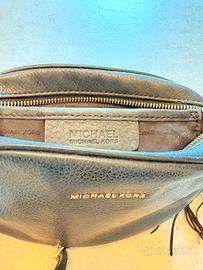 Borsa originale a tracolla Michael Kors in pelle martellata nera con dettagli color oro accessoriata da una nappa dello stesso materiale. Interno con fodera nera e taschina oltre che spazio per le carte.