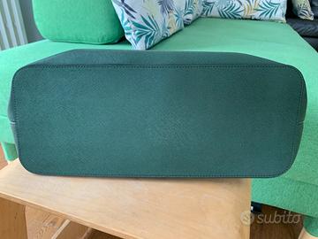 Borsa Michael Kors mod. Jet Set Travel multifunzionale in pelle saffiano verde, perfetta in ogni suo dettaglio e priva di segni d'usura, graffi, macchie. Dimensioni: larghezza 40cm sul bordo inferiore e 44cm su quello superiore, altezza 27cm e 16 cm di profondità. Dispone di tre vani, di cui uno centrale imbottito con cerniera per tablet o computer fino a 15", e due sui lati dotati di tasche (una con cerniera) per cellulare ed effetti personali, oltre a un gancio per le chiavi. E' corredata della sua dust bag per riporla.