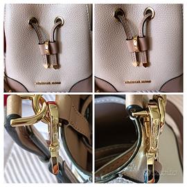 Borsa Michael Kors in pelle martellata a mano o a tracolla modello Mercer Gallery secchiello mini colori rosa/bianco/malva, logo anteriore, hardware dorato, chiusura superiore con coulisse, maniglia superiore staccabile, tracolla regolabile, interno in pelle, portamonete/divisore interno con bottoni removibile, piedini protettivi, pari al nuovo.