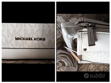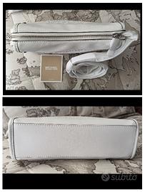 Borsa a tracolla grande logata Michael Kors (in PVC, poliestere e poliuretano) modello Harrison LG XBODY colori bianco ottico e grigio chiaro (optic white/allum), logo in rilievo nella parte anteriore, hardware argentato, chiusura con zip, tracolla con moschettoni regolabile e removibile, fodera interna logata, due tasche interne a bustina, nuova con cartellino. Le dimensioni sono: - lunghezza 24 cm - altezza 16 cm - profondità 7,5 cm