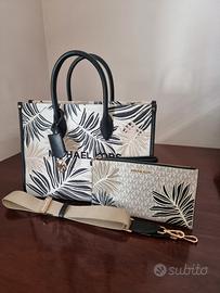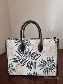 vendo borsa modello Mirella beige e nera con splendidi motivi di foglie su cotone con logo ricamato. È dotata di tracolla in aggiunta unisco pochette coordinata misure 35×25×11 circa