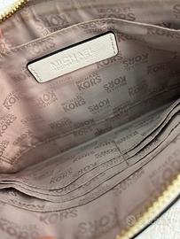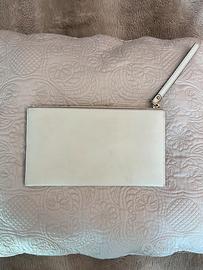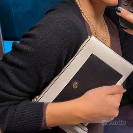 Borsa/pochette Michael Kors originale in ecopelle saffiano bicolore, bianco e nero, con dettagli dorati. Chiusura con zip superiore e tasca esterna con bottone in oro a pressione.