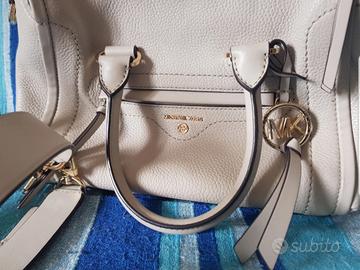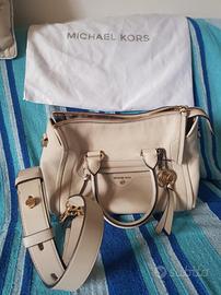 Borsa M. Kors originale in pelle martellata morbida, colore beige e dettagli color oro, scomparti esterni e tasche interne, foderata, chiusura con zip, dotata di tracolla e sacca antipolvere. Pari al nuovo!