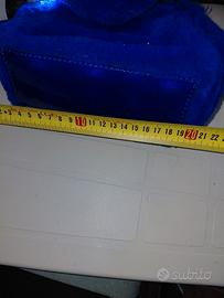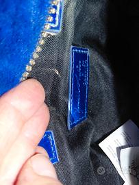 Borsa mini originale Carpisa in pelliccia sintetica blu elettrico con manici rigidi lucidi decorati con strass. Stile glam e trendy, perfetta per serate o occasioni speciali ✨ Dettagli: Brand: CARPISA (logo in rilievo all'interno) Colore: blu elettrico/cobalto Materiale: pelliccia sintetica + manici rigidi in plastica lucida con strass Tracolla nera rimovibile Chiusura: zip Interno: fodera in tessuto nero Dimensioni: circa 20 cm × 15 cm × 9 cm Condizioni: buone, piccole macchiette di cipria all'interno poco visibili