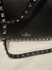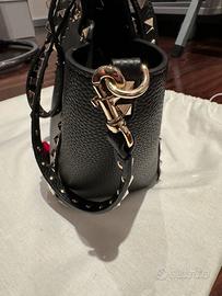 Borsa colore nero in pelle martellata con stud dorati, modello Valentino Rockstud mini, misure L26xH19xP11. Portabile a spalla a mano o con tracolla. Si dust bag. No scontrino o fattura.