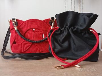 La borsa fatta a mano con il cordoncino di cottone ,con la macchina da cucire, utilizzando la tecnica zigzag per un effetto originale.
