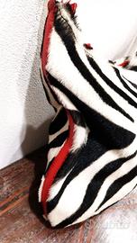Borsa Blumarine originale con motivo zebra bianco e nero in cavallino. Design vintage elegante e particolare con finiture rosse a contrasto e tracolla regolabile.