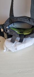 borsa con tracolla, base in gomma, 3 tasche interne(1 con cerniera),interno blu e verde