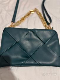 Elegante borsa in similpelle color verde petrolio, caratterizzata dal classico intreccio effetto Bottega e dettagli dorati.