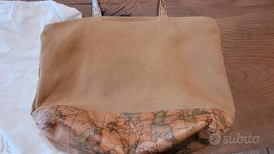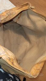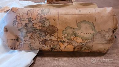 Borsa morbida con stampa mappa del mondo. - Dettagli in pelle. - Manici con inserti glitterati. - Patch logo in pelle sul davanti.
