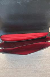 Materiale esterno: Poliuretano Materiale della fodera: Poliuretano Chiusura: chiusura magnetica (in metallo color oro un po'schiarito negli anni) Presenta il logo LOVE MOSCHINO in lettere metalliche dorate a rilievo sulla parte frontale Tracolla dorata regolabile con un inserto in simil pelle per il massimo comfort sulla spalla (anche questo inserto leggermente "invecchiato a causa dell'uso) Organizzata internamente in più scoparti (3) di colore rosso