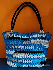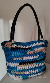 Borsa multicolore in fettuccia lavorata uncinetto.non è foderata.