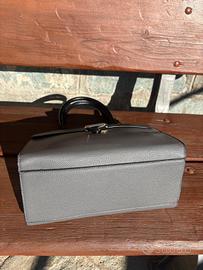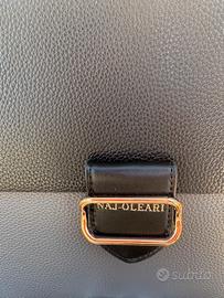 Borsa marca Naj-Oleari a doppia colorazione nera e grigia, con ampia fibbia dorata e inserti (cerniere e ganci) in tinta. Dimensioni medie, con interno in stoffa decorata e molteplici tasche; chiusura superiore con cerniera e presenza di una tasca posteriore anche essa fornita di cerniera, oltre che di una tasca anteriore con clip magnetica sotto la fibbia stessa.