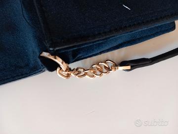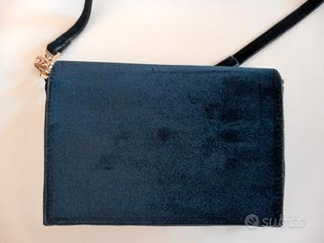 Elegante borsa in velluto nero, impreziosita da perle decorative, tracolla con catena dorata, con due scomparti e taschina all'interno con cerniera, misure 19 x 14 cm., marca Nali, mai utilizzata
