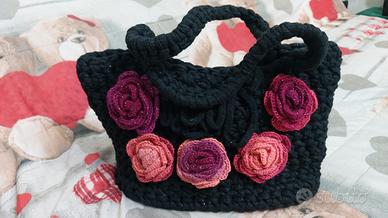 borsa nera con roselline fatte ad uncinetto