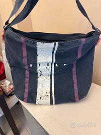 Borsa a tracolla Sisley in tessuto blu scuro, dal look casual e capiente. Presenta una stampa frontale con tre bande verticali nei toni del bianco e del viola, effetto leggermente vissuto. La tracolla è regolabile e realizzata nello stesso materiale del corpo borsa, ideale per un uso quotidiano e informale.