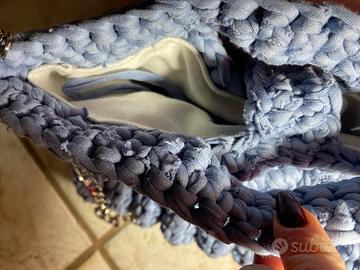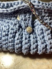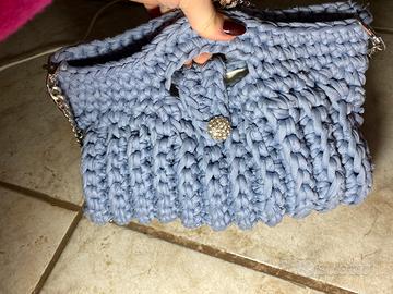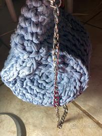Borsa molto chic fatta interamente a mano, è possibile portarlo a mano o indossare tramite tracolla, la chiusura è molto particolare in quanto vi è un bottone ricoperto da brillantini e la forma della borsa e altrettanto particolare in quanto tonda basti vedere le foto