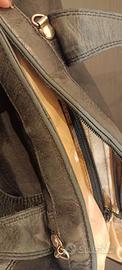 Borsa nera in nylon con inserti in pelle, con tasche interne di cui due ampie con chiusura a zip, piedini metallici sul fondo, utilizzabile a mano tipo bauletto ma provvista anche di due occhielli metallici per consentire di aggiungere una tracolla.