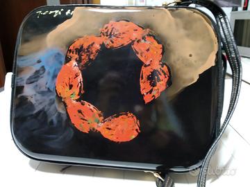 PARTICOLARE BORSA DI COLORE NERO CON LATO RIGIDO DIPINTO E LATO CON INSERTI ROSSI. UTILE ANCHE COME PORTA PC. CON TRACOLLA. MISUIRA CM 33x26