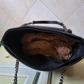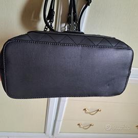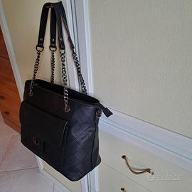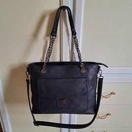 Borsa nera Conbipel con manici a catena e tracolla rimovibile e regolabile, effetto trapuntato, con patta frontale e tasca a zip sul retro. Misure: