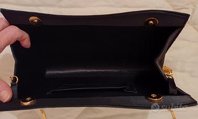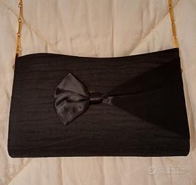 Borsa nera da sera in tessuto lavorato in rilievo. con decorazione fiocco in raso e catenella metallica dorata. Buordo superiore con forma "a onda". Può essere portata a spalla, a tracolla oppure come pochette. Usata 1 volta, come nuova. 19,oo euro