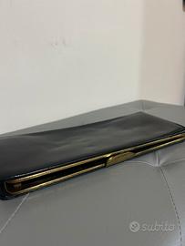 Borsa nera elegante vintage originale anni ‘60, a mano modello busta in pelle nera lucida con chiusura dorata e interni in caldo camoscio color cammello