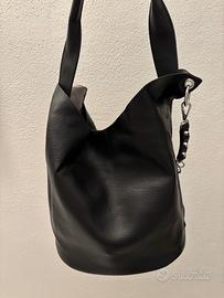 borsa nera capiente da portare a mano o a spalla con bella tracolla in metallo disegno geometrico con cuori. Borsa grintosa di carattere.