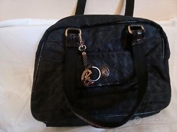 Borsa nera in similpelle e stoffa tipo seta a spalla con profili similpelle, in ottime condizioni, chiusura con zip, tasca con cerniera interna ed esterna e tasca frontale mis.25 x 25