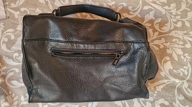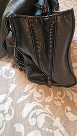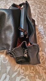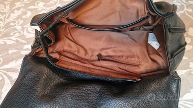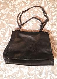 Borsa in ecopelle nera morbidissima, ampia patella frontale con 2 bottoni magnetici nascosti, 2 cerniere laterali per aumentare la capienza, chiusura interna con cerniera, una tasca interna con cerniera e una porta documenti. Altra tasca esterna posteriore con cerniera. Portabile a mano o con tracolla a catena regolabile e rimovibile. Misure in cm: 30x24x larghezza al fondo 14. Condizioni ottime.
