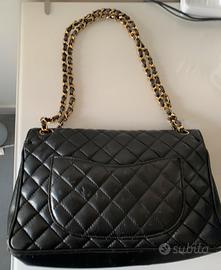 Vendo elegante borsa nera trapuntata stile Chanel classico, con tracolla a catena dorata intrecciata.