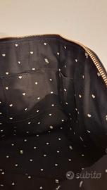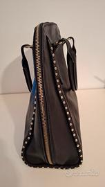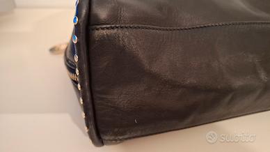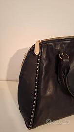 Borsa a mano pelle nera Twinset, apertura con cerniera, due manici, borchie. Tasca interna con cerniera e altre due taschine aperte minimi segni di usura sul fondo dimensioni: larghezza max cm 38 altezza cm 29 profondità cm 12