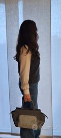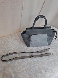 Borsa in morbida pelle color grigio chiaro con tasca frontale in cavallino naturale, firmata Pelletteria Nicoli.