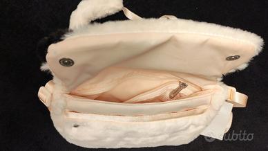 Borsa a tracolla in pelliccia sintetica colore Guava Ice con swoosh nero. Mai indossata e ancora provvista di etichetta.