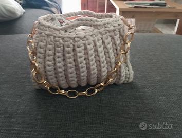 Graziosa borsa in fettuccia beige fatta a mano con uncinetto con nanico di catena oro per chi vuole sempre essere a la moda con qualunque look