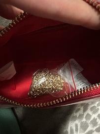 Borsa hobo in vernice rossa con manico chiuso da bottone, tracolla rimovibile a catenella, chiusura con zip e hardware in metallo dorato.