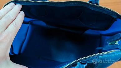 Borsa in gomma e pelliccia sintetica blu corredata da portamonete in pelliccetta sintetica. Nuova mai usata Misure base 38x20 h 30 cm