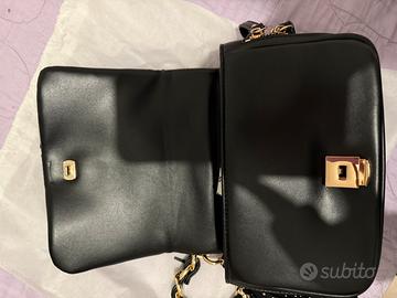Dettagli in metallo dorato, logo frontale e catena dorata con inserto in ecopelle per una portabilità comoda a spalla o a tracolla.