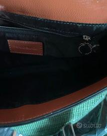 Borsetta (pochette) con tracolla allungabile, marca Pennyblack, colore marrone e nero con borchie, nuova con cartellino e borsa protettiva originale. Il materiale è poliestere con spalmatura in poliuretano, simile a finta pelle lucida. Internamente ha una tasca con cerniera. Dimensioni: lunghezza 27 cm (alla base) e 30 cm (in alto), larghezza 6,5 cm, altezza 19 cm