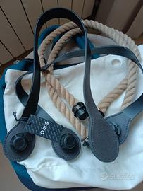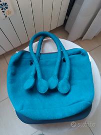 vendo borsa o bag originale (con tanto di scontrino) blu navy grande (larga 33cm alta 27cm) con tre manici lunghi 70cm, uno in corda intrecciata, uno in tessuto e uno in simil pelle quest' ultimo ancora con il cartellino attaccato, due interni uno originale in tessuto color petrolio come i manici, l'altro in cotone color panna cucito da me e infine un bordo di lana multi color per arricchirla.