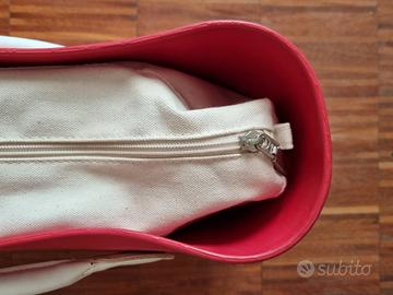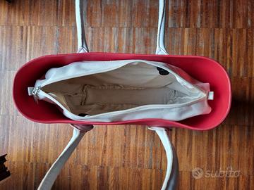 Borsa O Bag grande rossa con manici in pelle bianca e fodera color panna.
