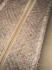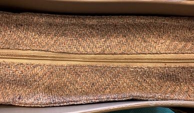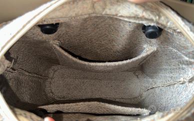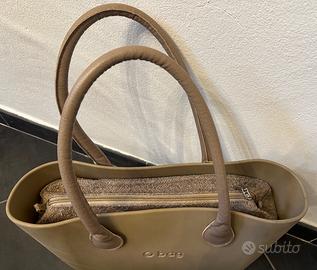 Borsa O bag originale, rigida, color sabbia e sacca interna rimovibile in tessuto intrecciato rosa antico e grigio chiaro. Manici in eco pelle.
