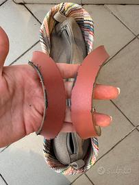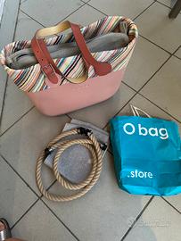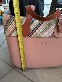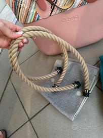 Borsa O bag rosa cipria Manici in ecopelle marrone + manici in corda Bordo a righe colorate + bordo tinta unita grigio Usata pochissime volte.